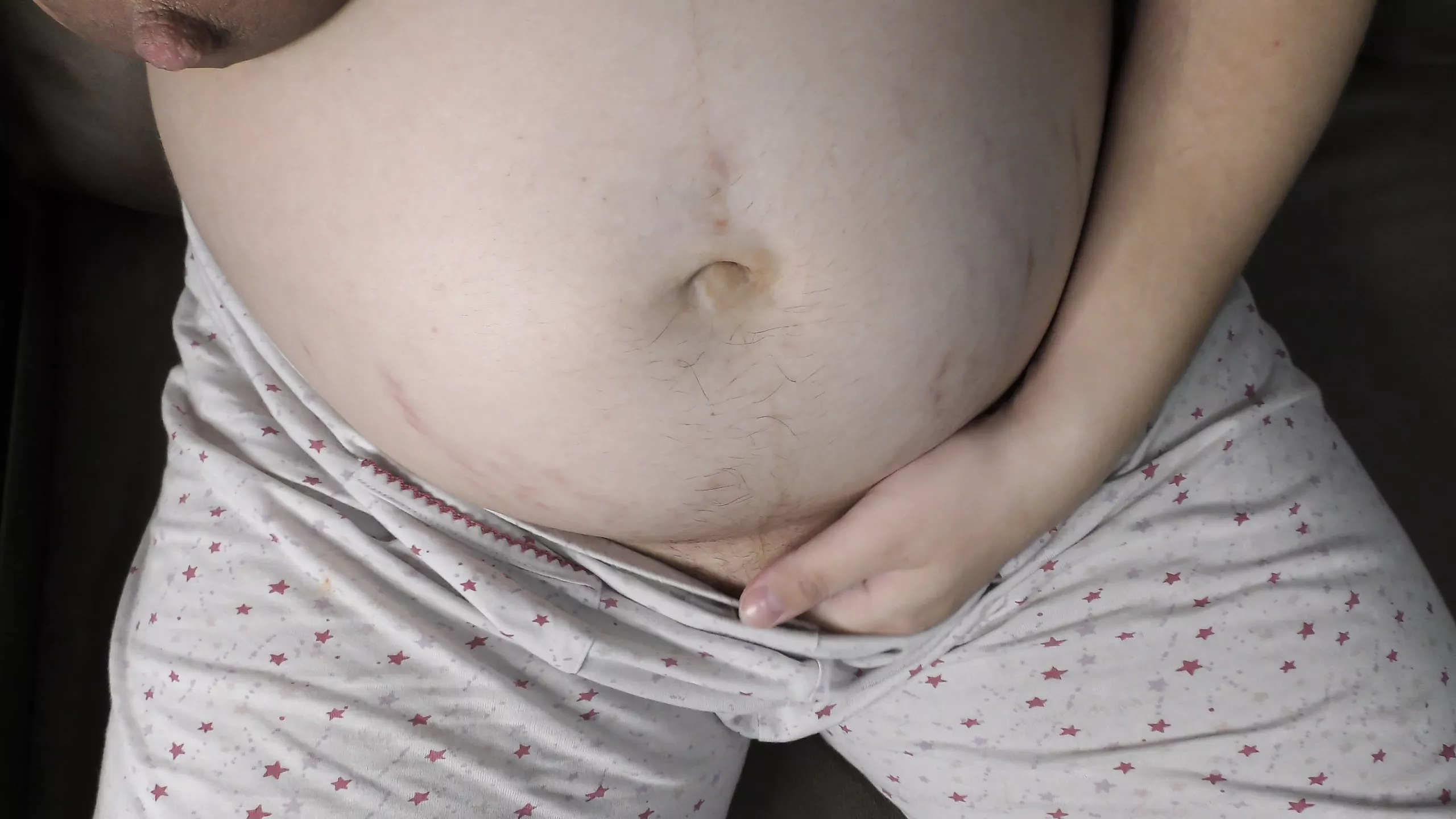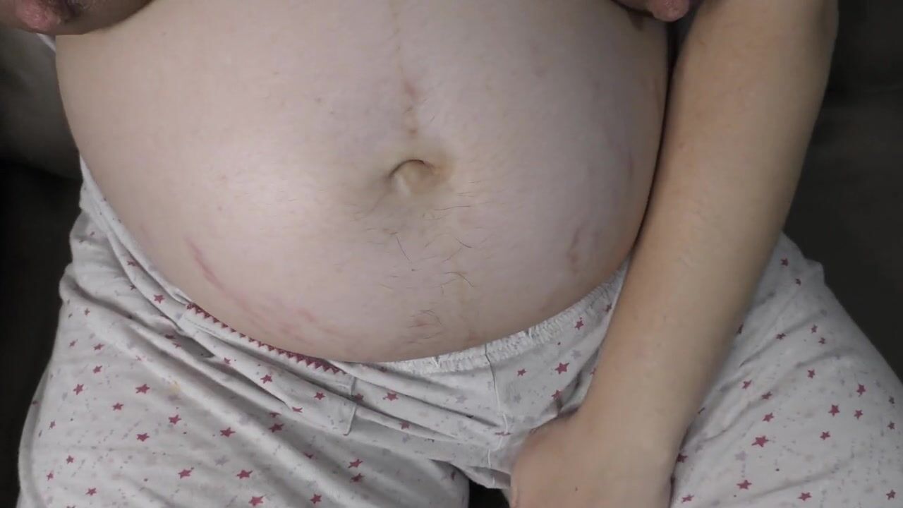 9 month pregnant slutwife Milky Mari masturbate her hairy pussy and showing you her big boobs full of milk!