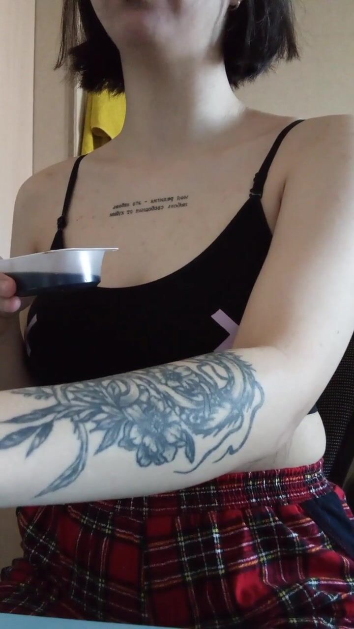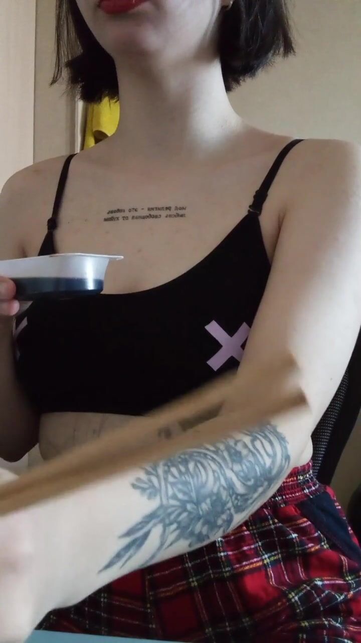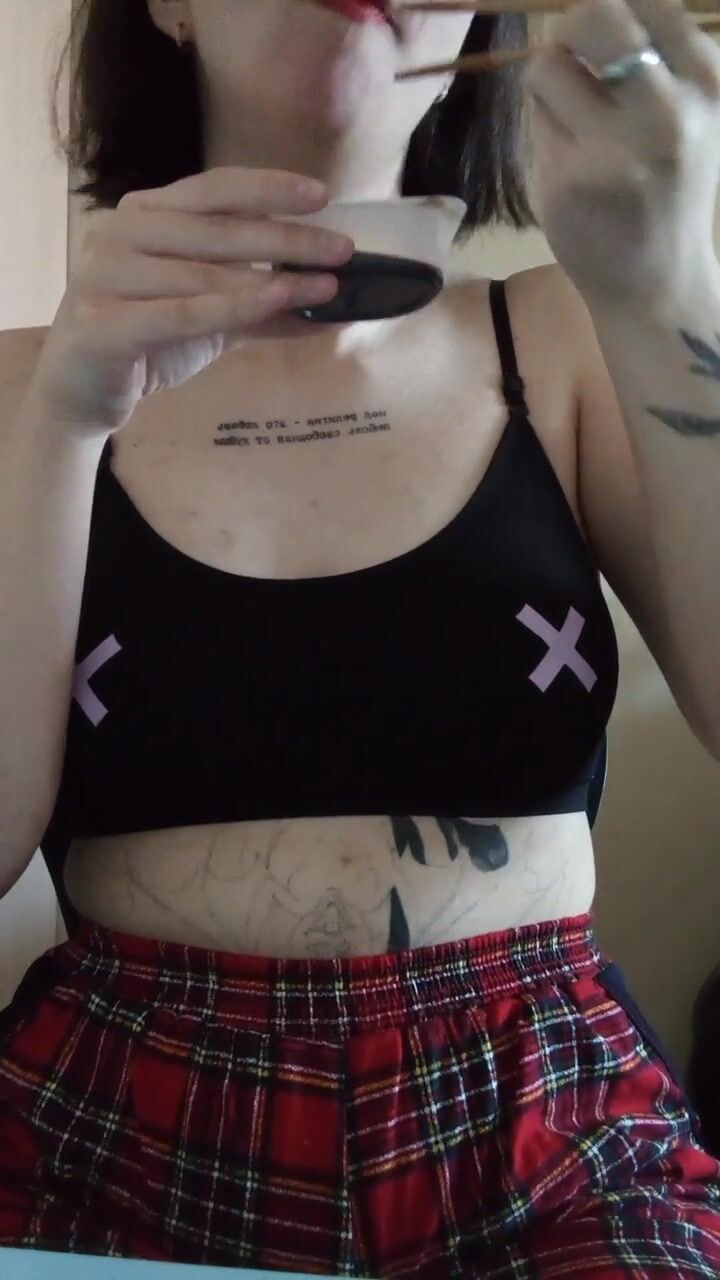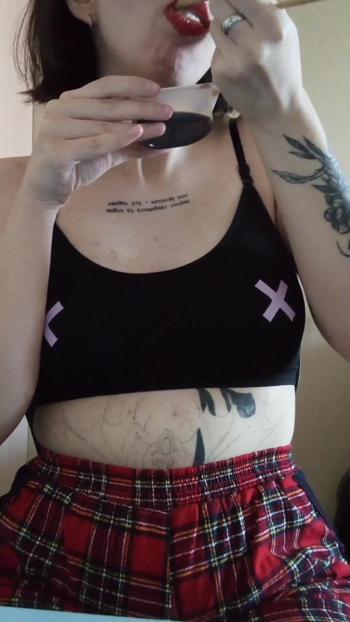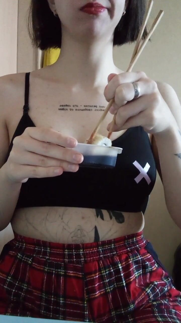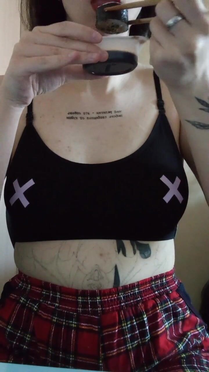 a girl with a tattoo in a top and a plaid skirt eats sushi