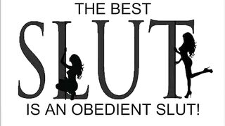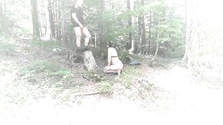 A naked submissive slut crouches in the woods while he pisses on her face