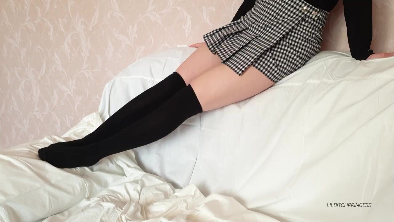 A schoolgirl in uniform shows her long legs