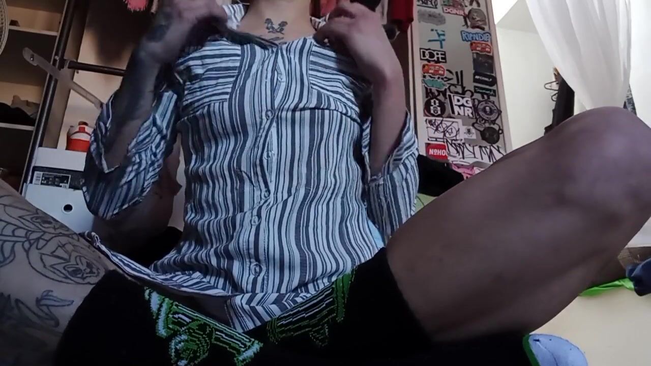 Schoolgirl tranny fucks classmate with tattooed dick! ANAL gapes, Cum covered ass