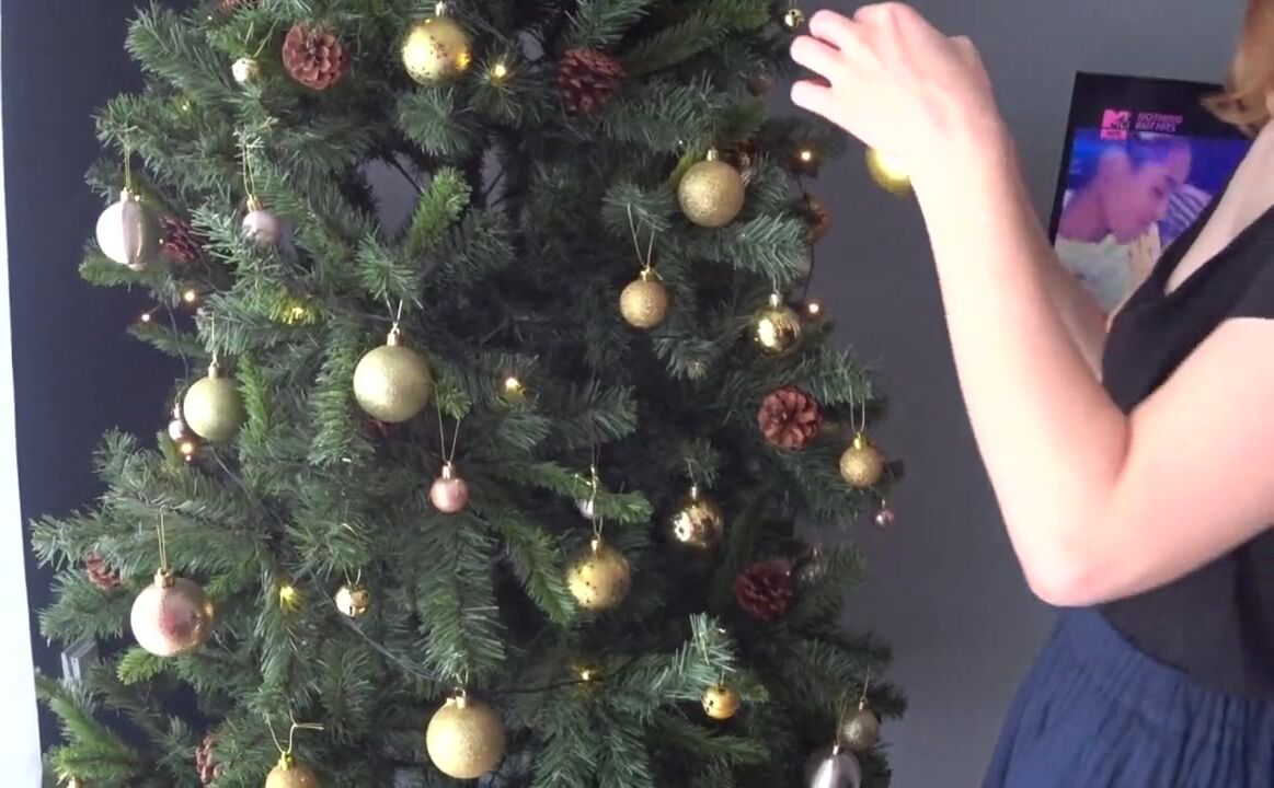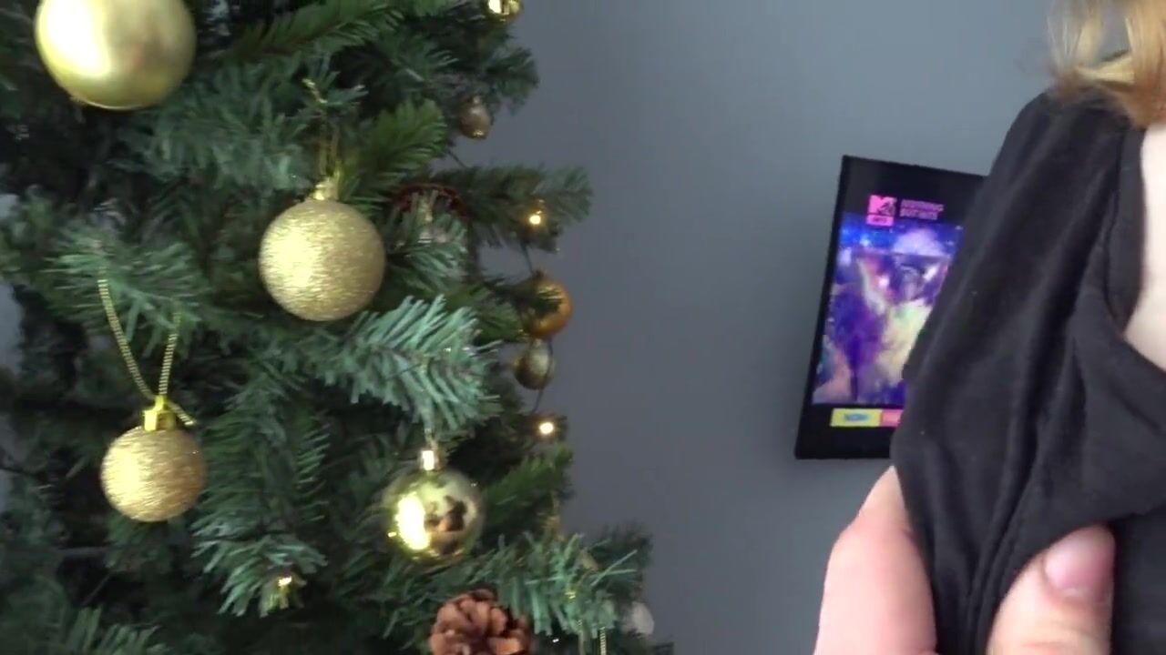 BABY SQUIRTING MILK NEAR THE CHRISTMAS TREE