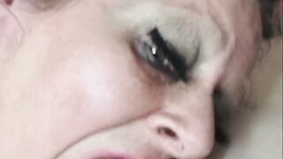 Dutch girl with needle pierced tits sucks cock and gets his cum in her eye
