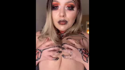Dutch girl with needle pierced tits sucks cock and gets his cum in her eye