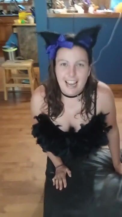 Cosplay kitty wife strips & rubs her itchy clit