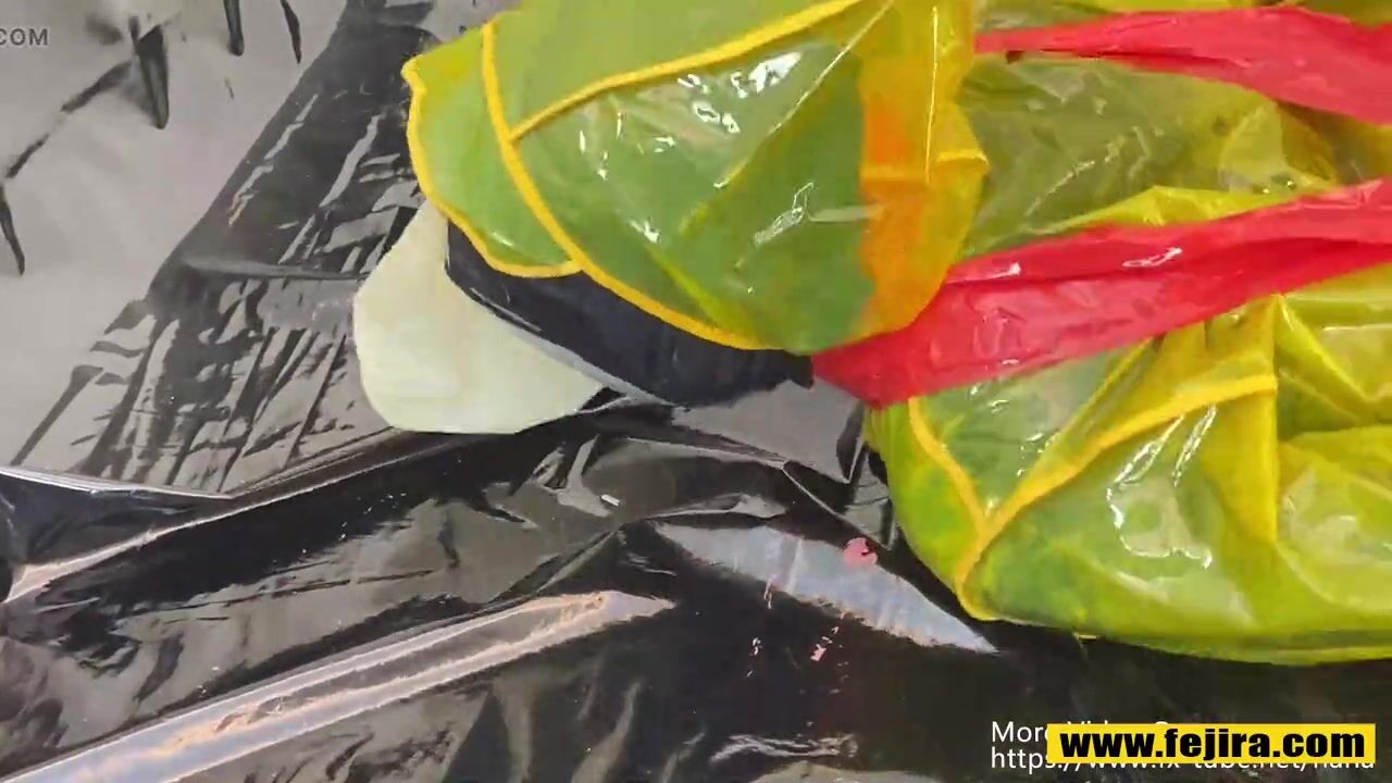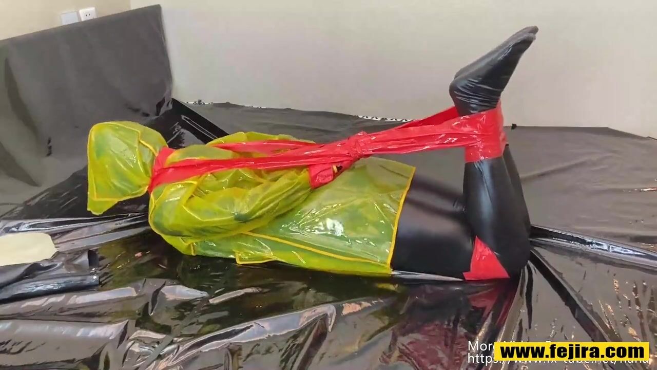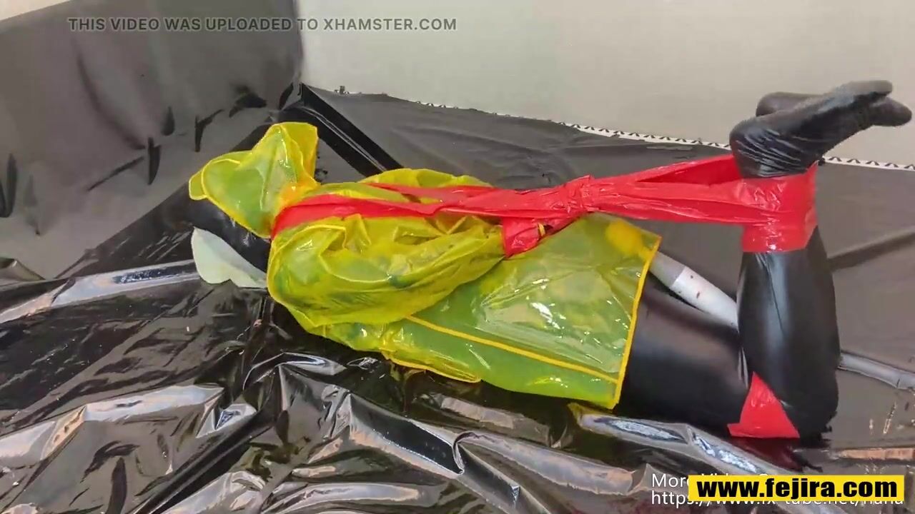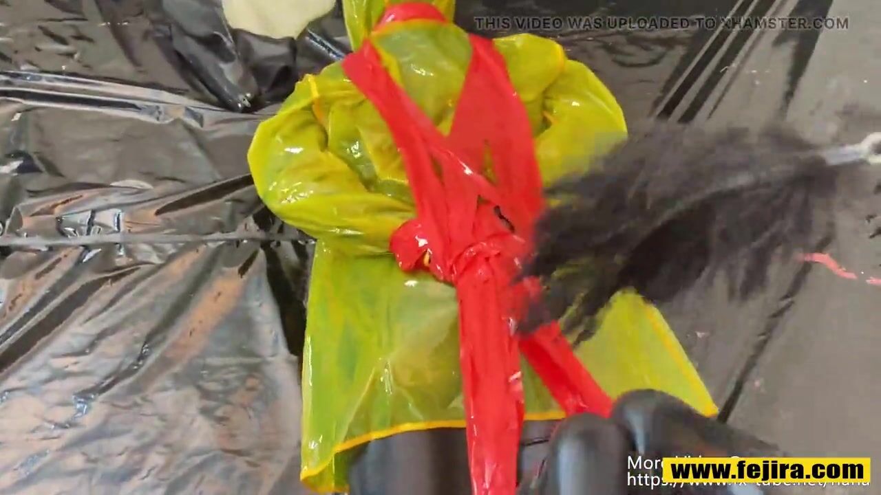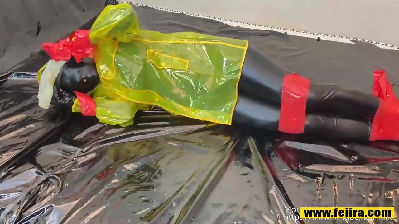 Fejira com Dressed in a yellow plastic raincoat tied with tape