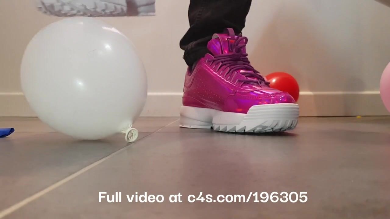 Girl crushing balloons with Fila Disruptor sneakers