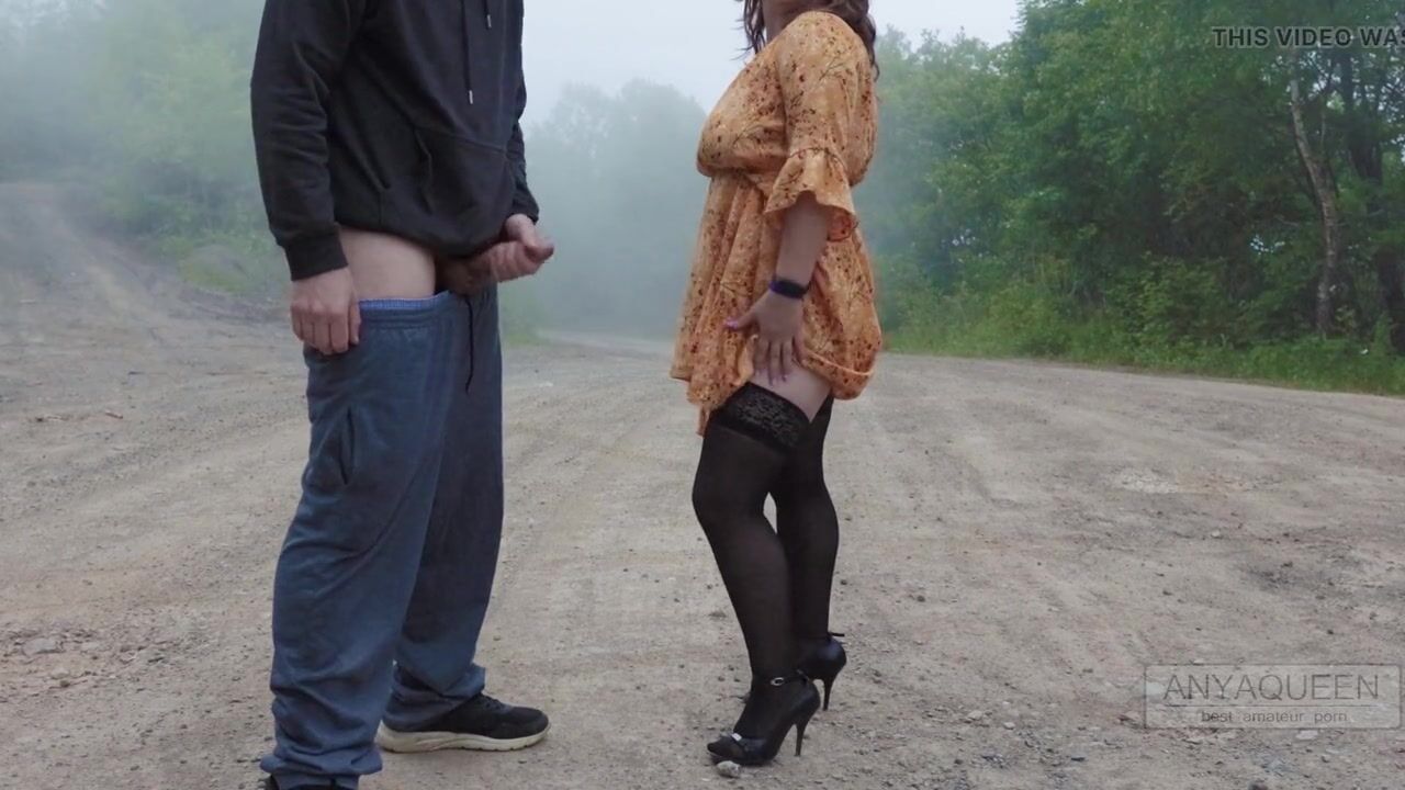 Handjob outdoors in stockings