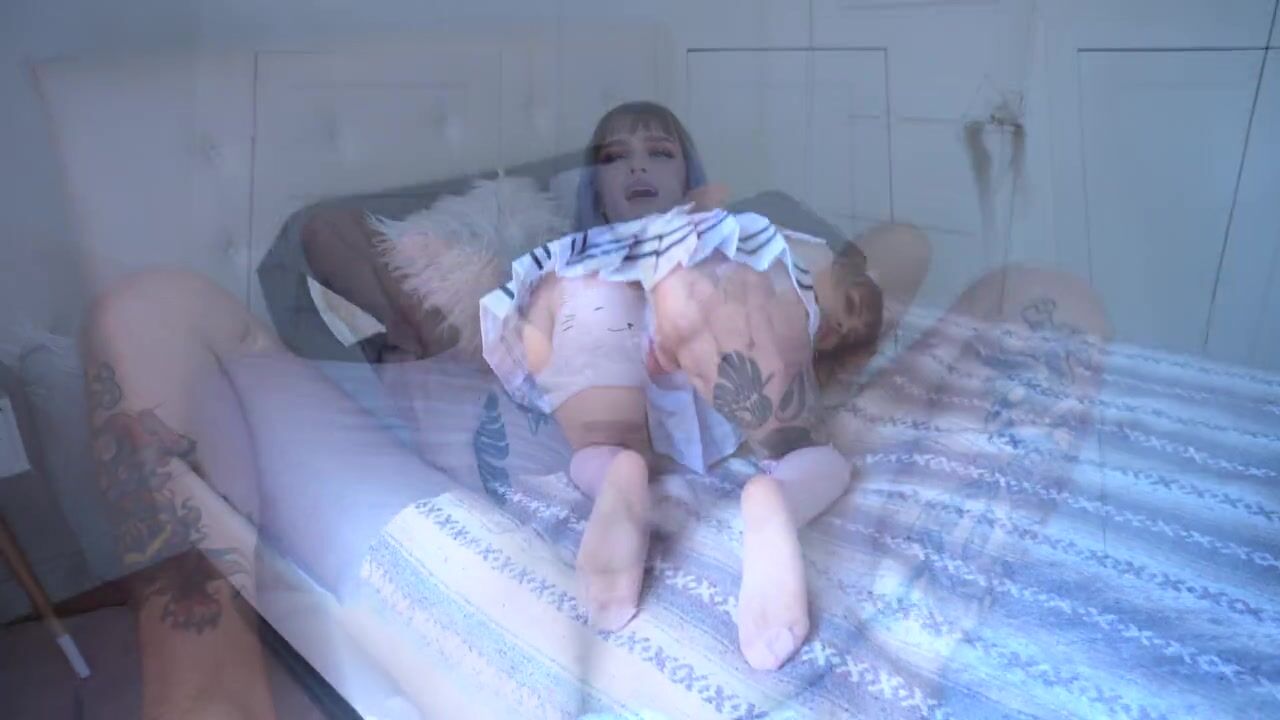 Schoolgirl tranny fucks classmate with tattooed dick! ANAL gapes, Cum covered ass