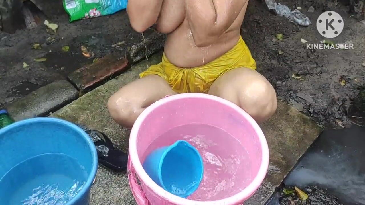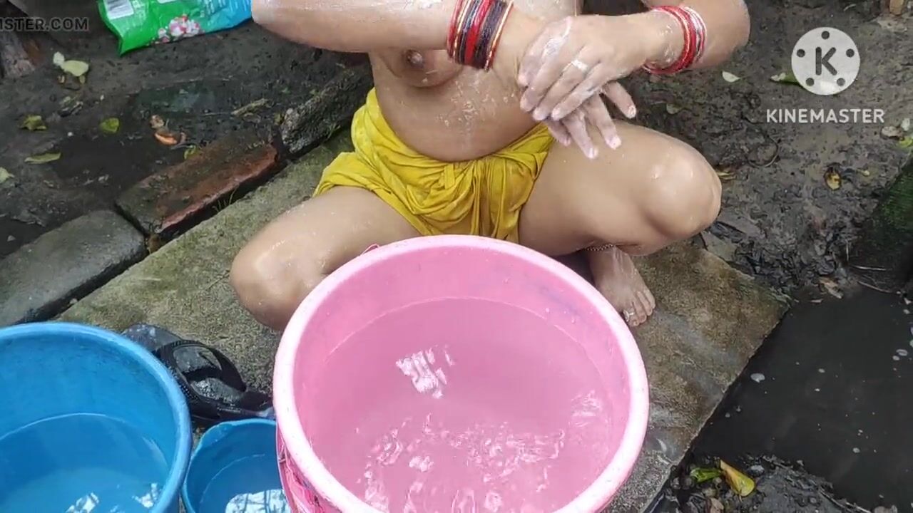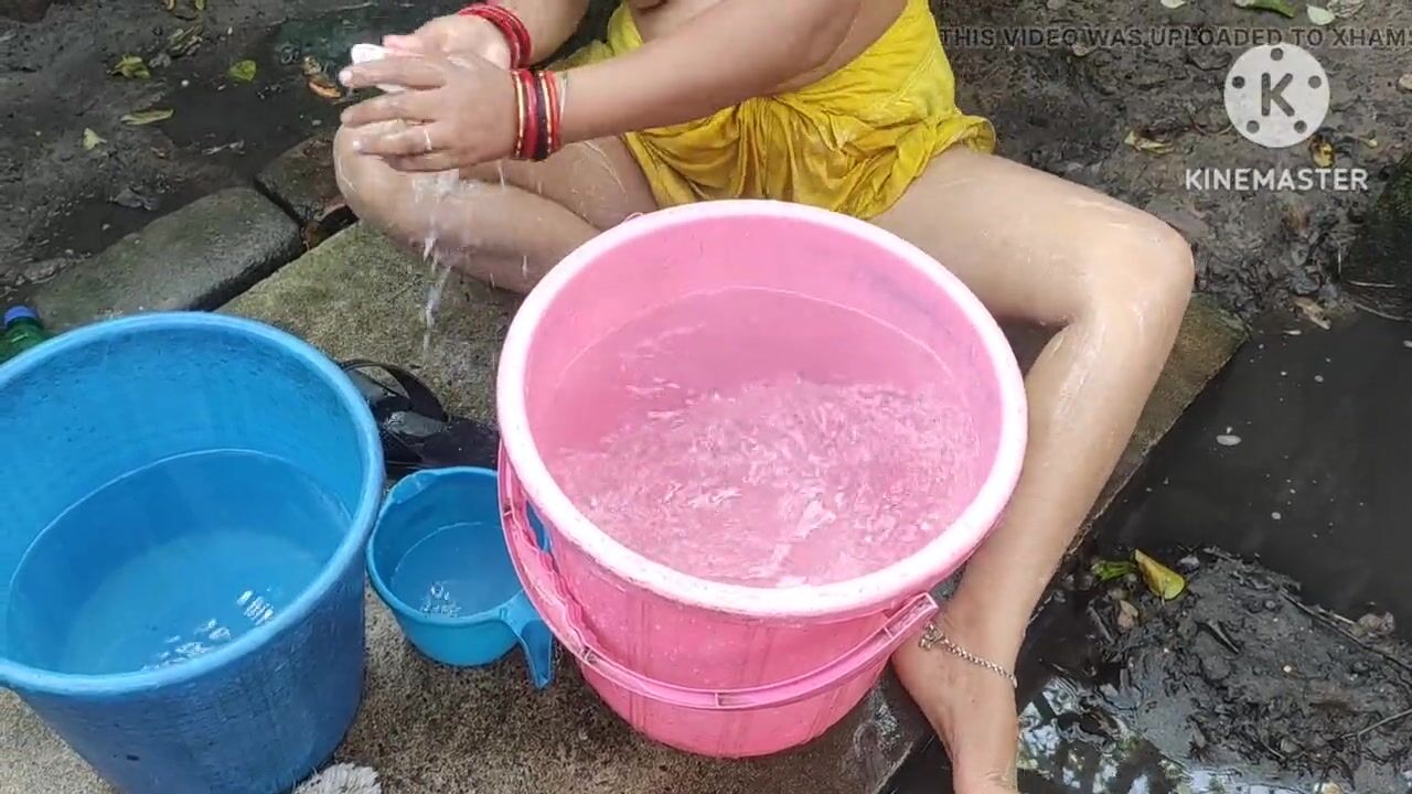 Indian bhabhi bathing outside with