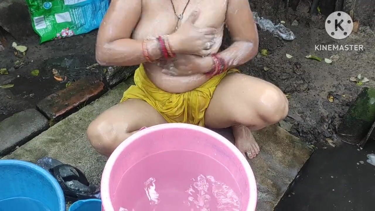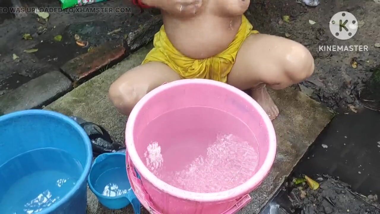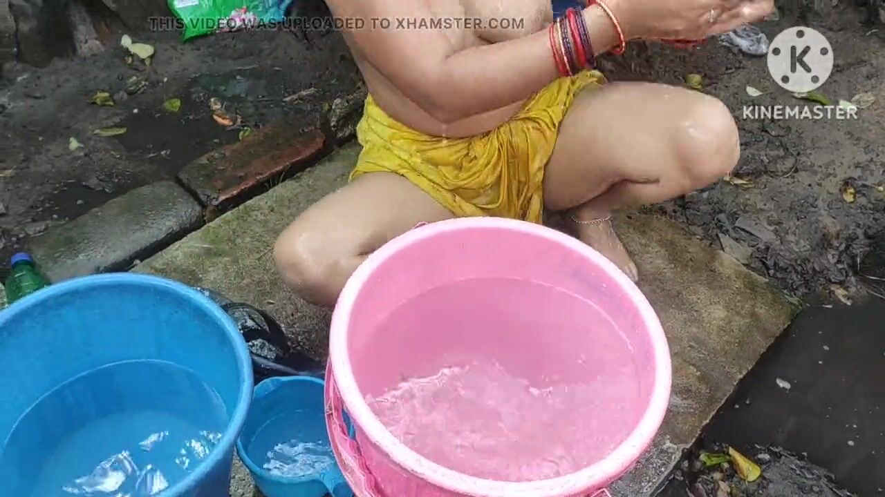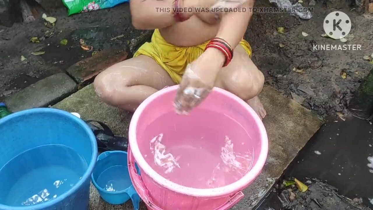 Indian bhabhi bathing outside with