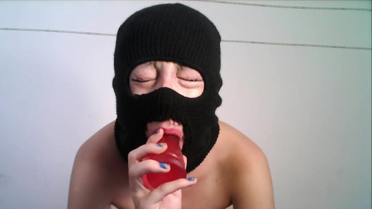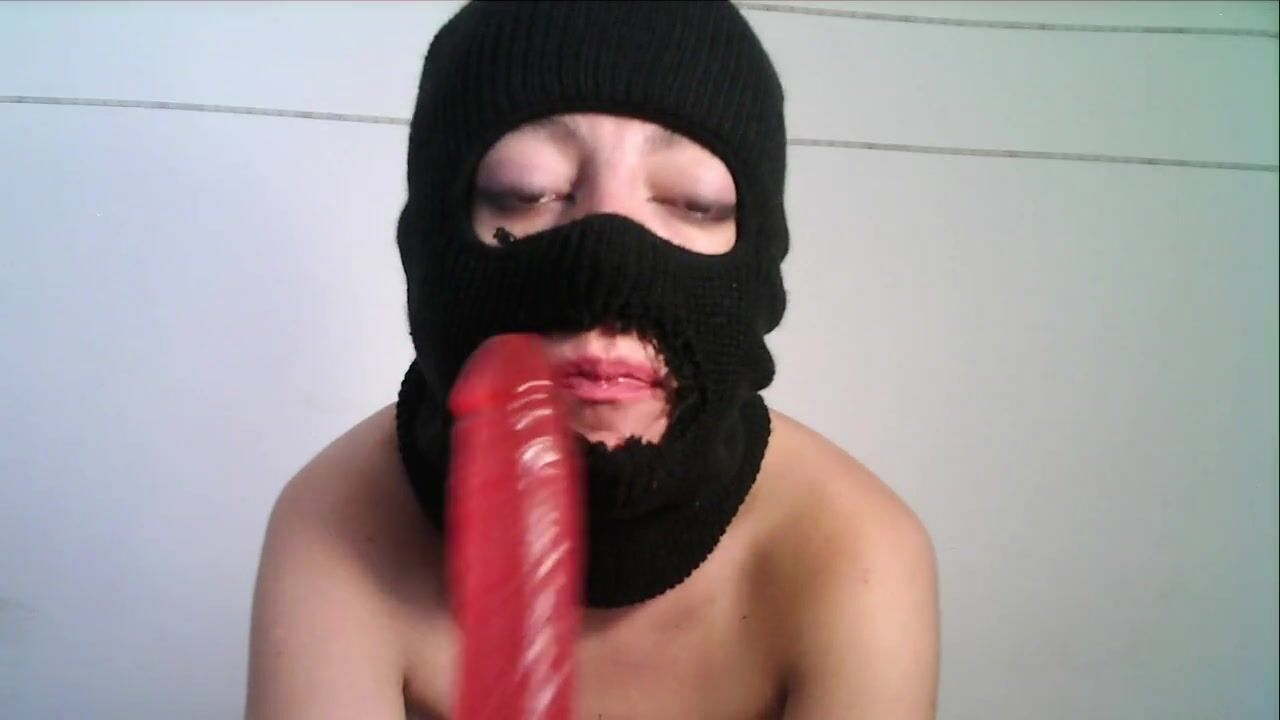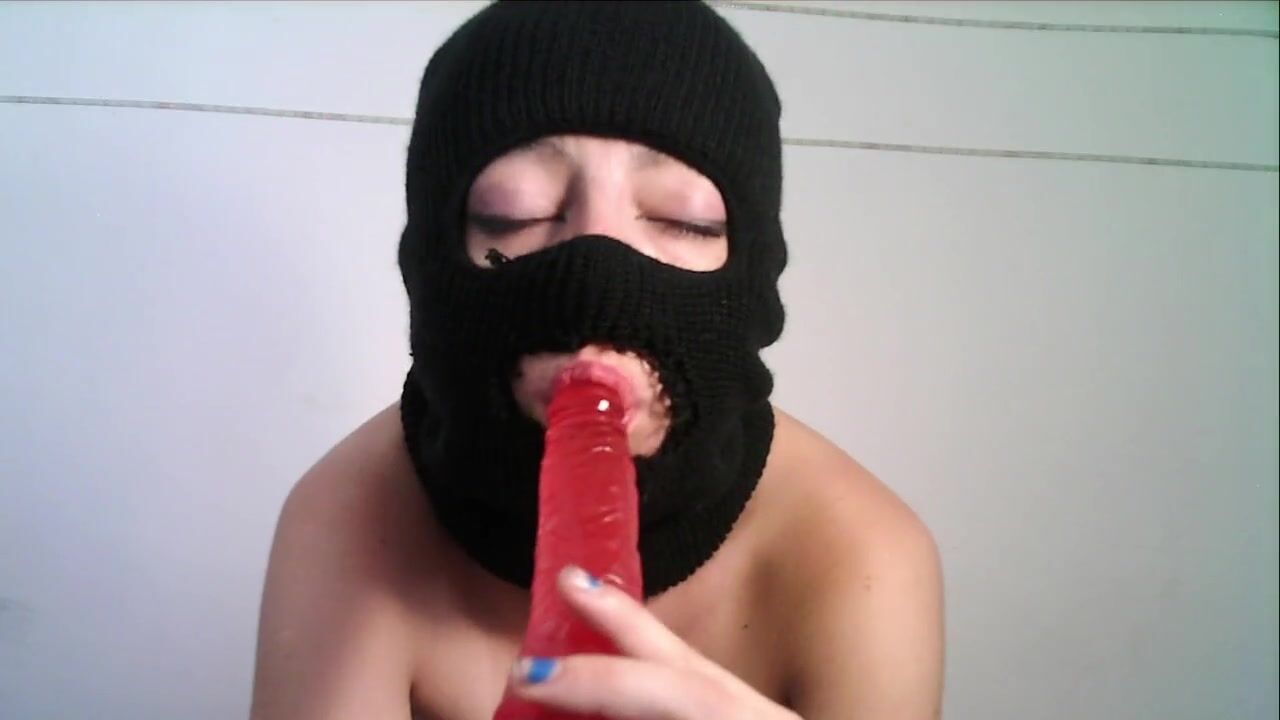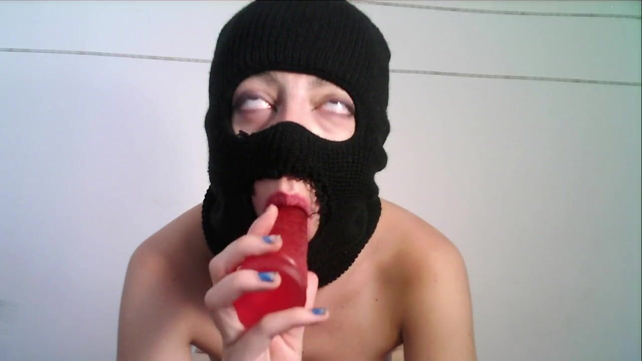 Masked teen giving a blowjob to a dildo