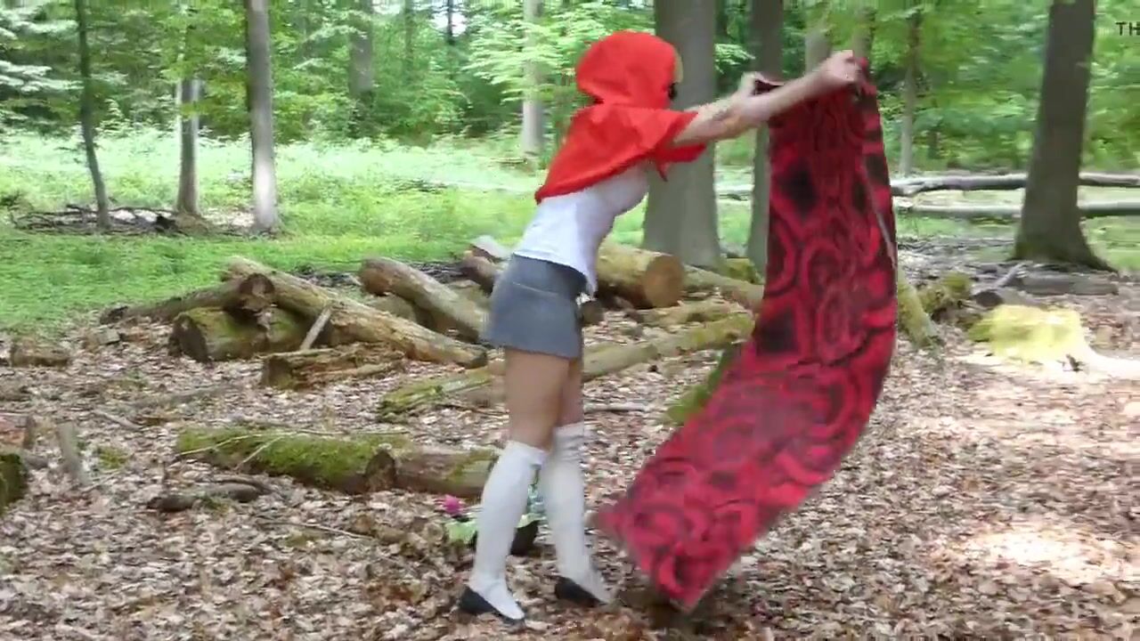 MILF masturbates with dildo in forest. Red Hood, knee highs