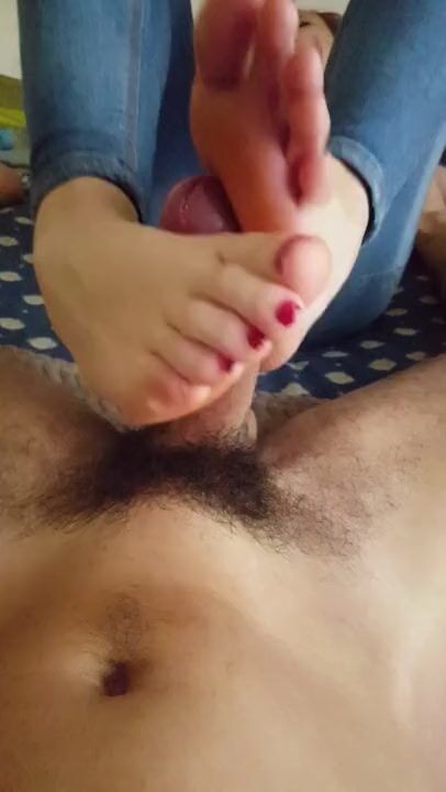 My girlfriend give me a hot FOOTJOB in red toes (cum on feet)