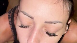Dutch girl with needle pierced tits sucks cock and gets his cum in her eye