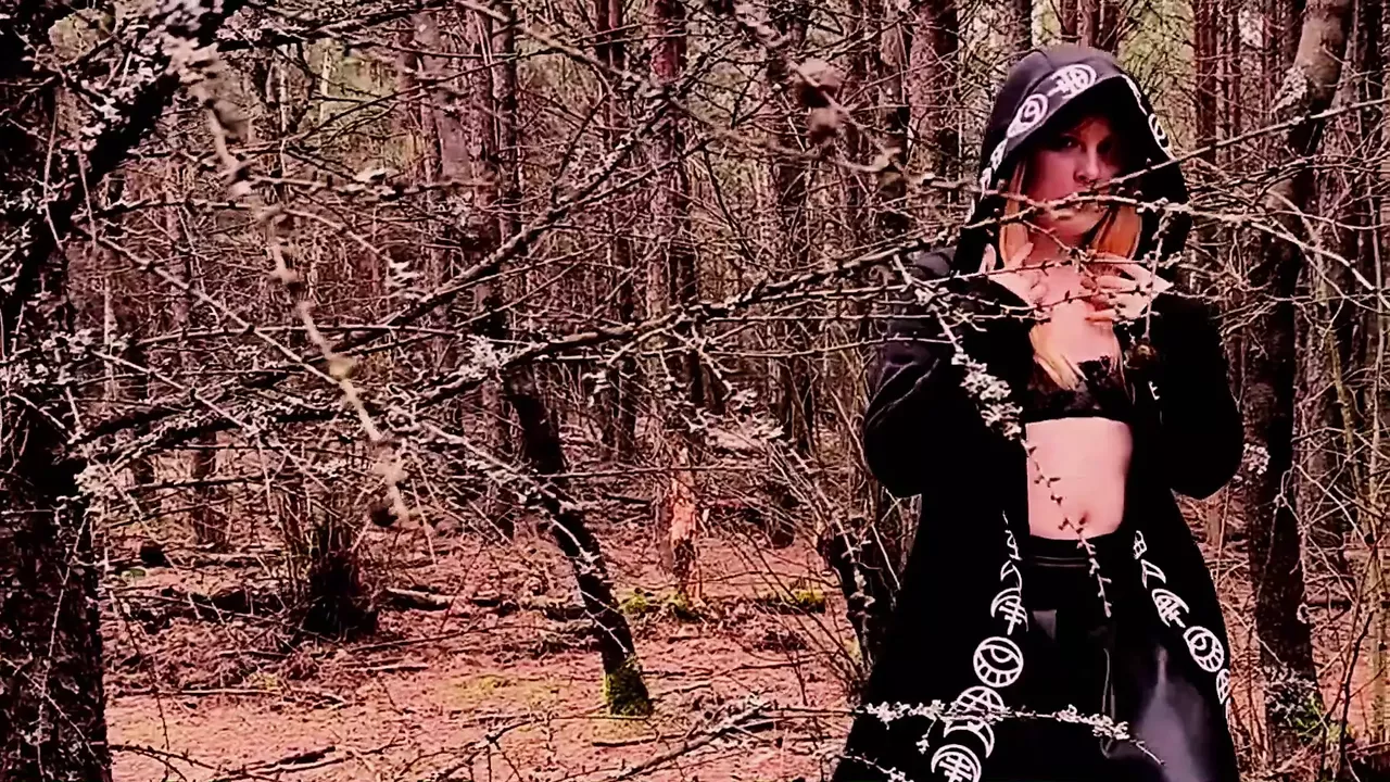 Naughty witch is playing with a vibrator in the forest
