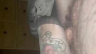 Dutch girl with needle pierced tits sucks cock and gets his cum in her eye