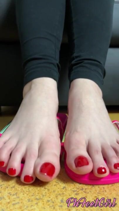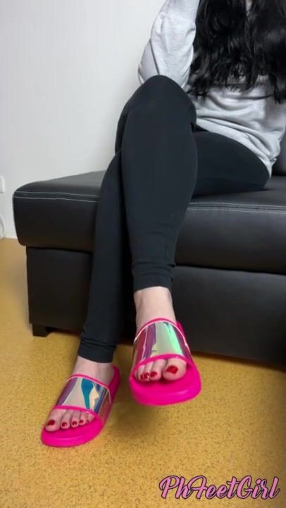 Pink slippers and red toes come taste them they are sweaty