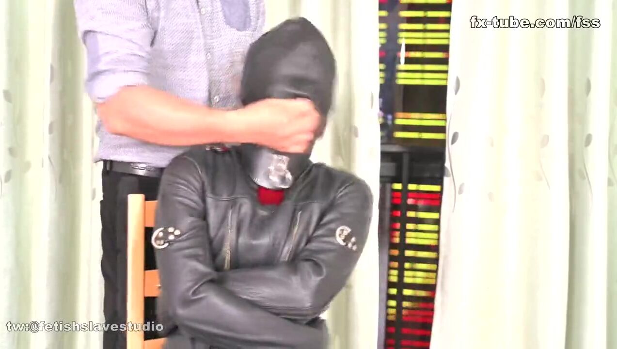 Red hair leather slave girl hood and straitjacket