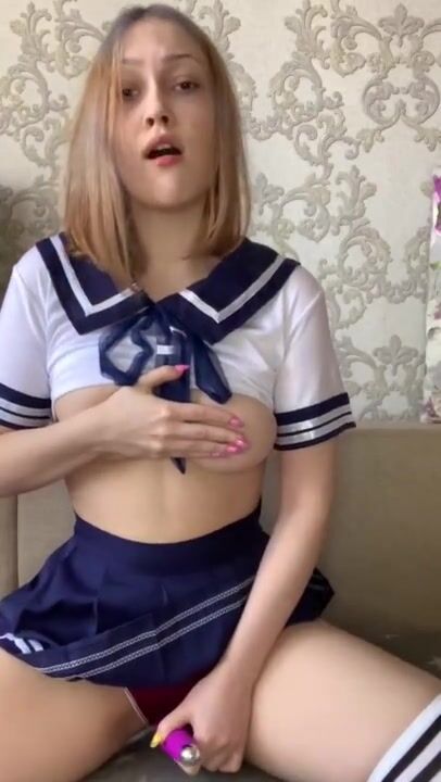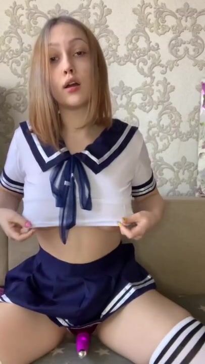 Spill out natural boobs from short student uniform top, wedgie thong leotard, hair...