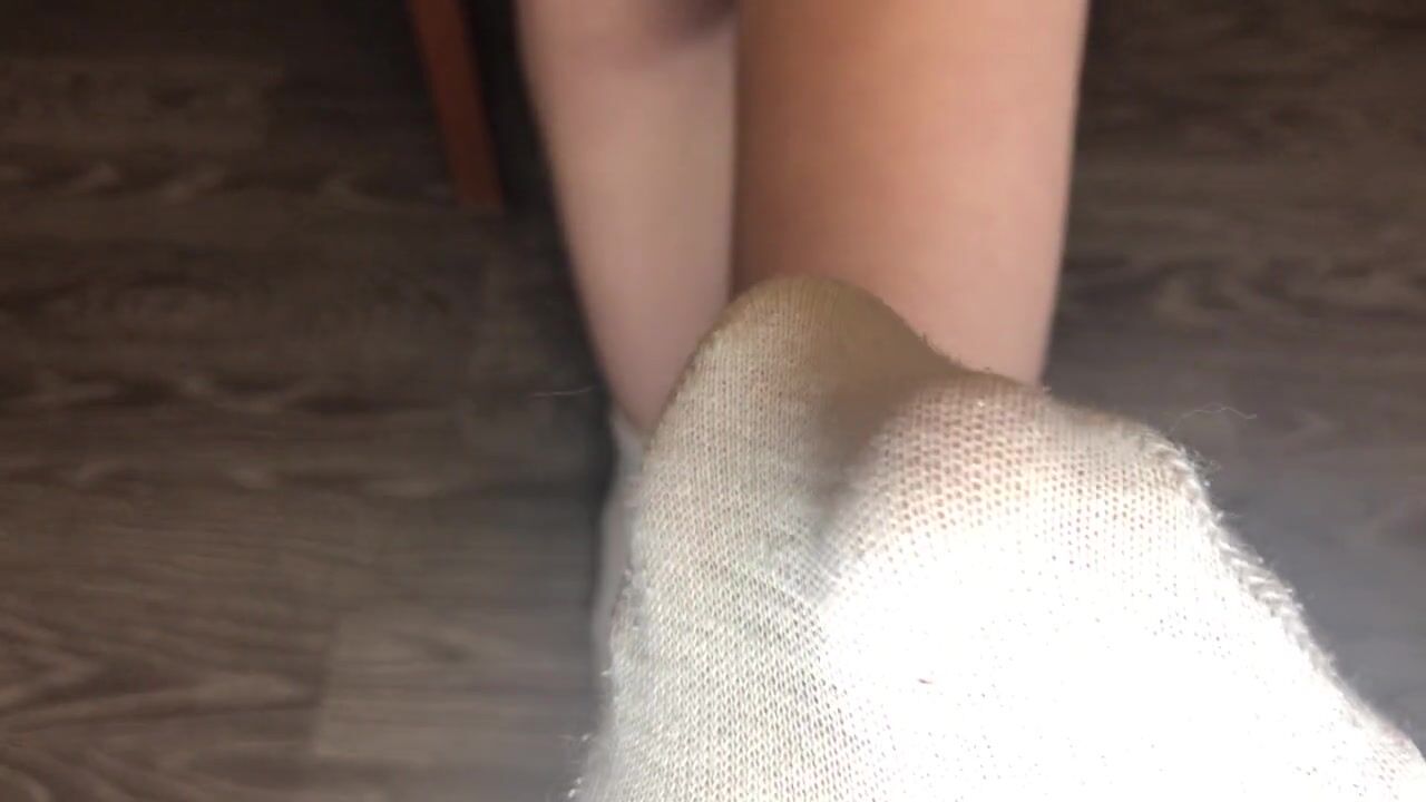STUDENT GIRL SHOWS WHITE SOCKS AND FEET AFTER STUDYING.
