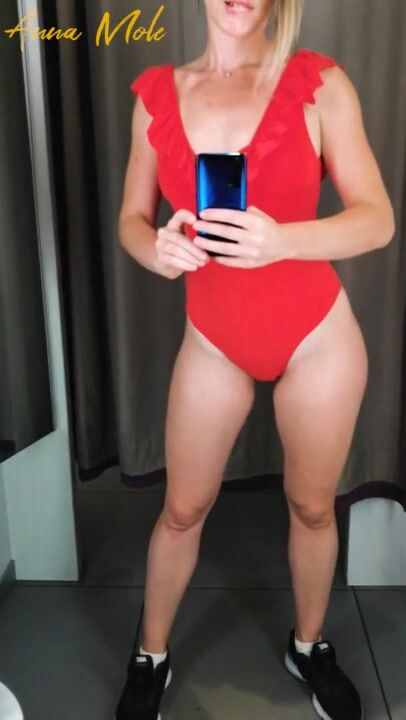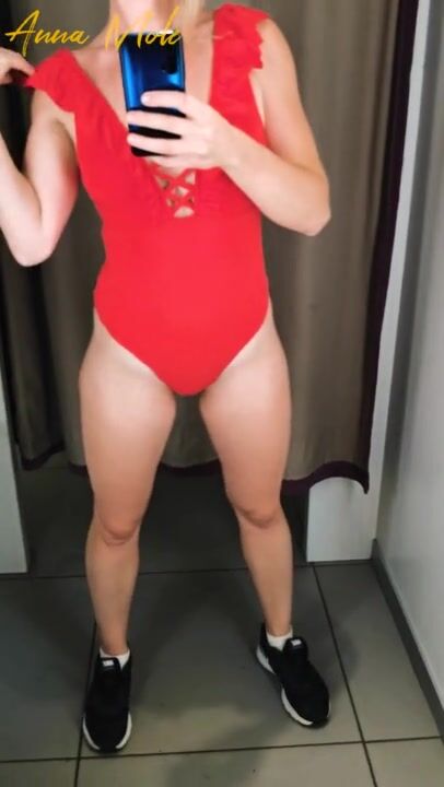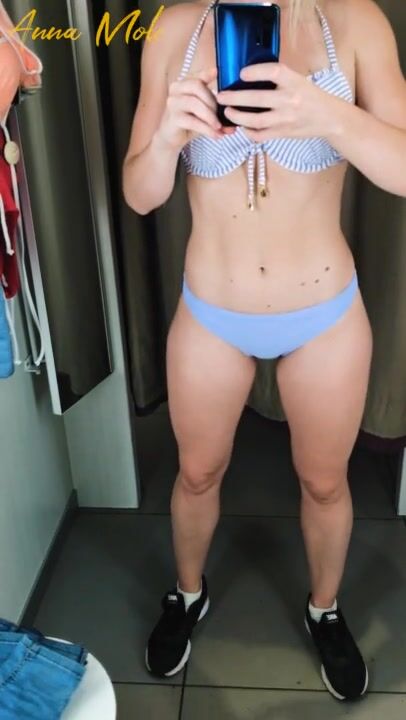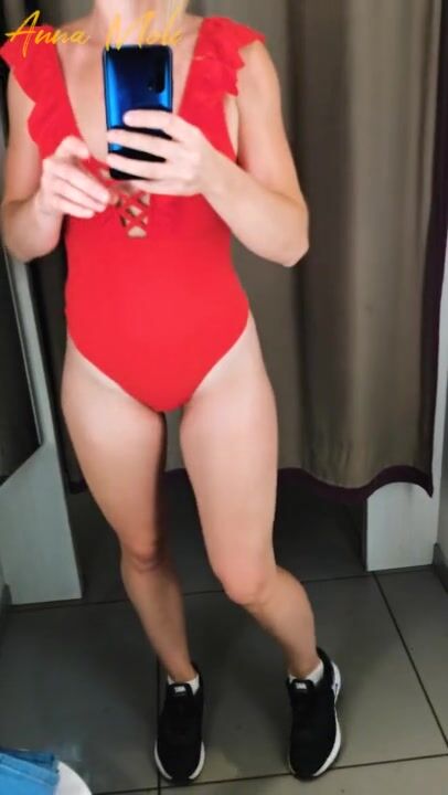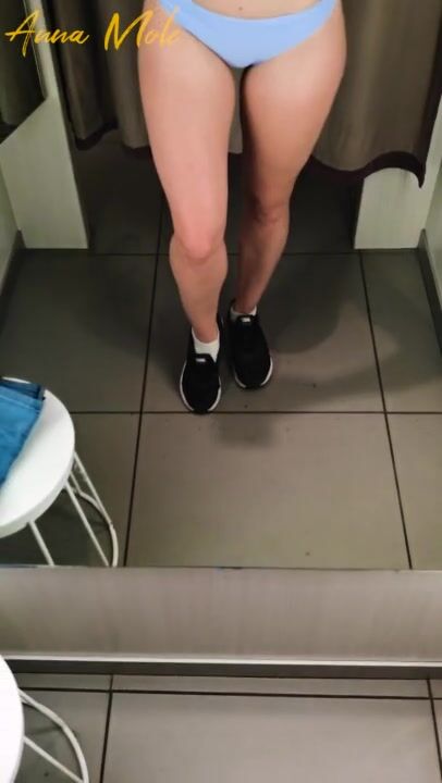The Girl in the Fitting Room is trying on Swimwear. POV.