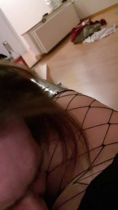 Dutch girl with needle pierced tits sucks cock and gets his cum in her eye