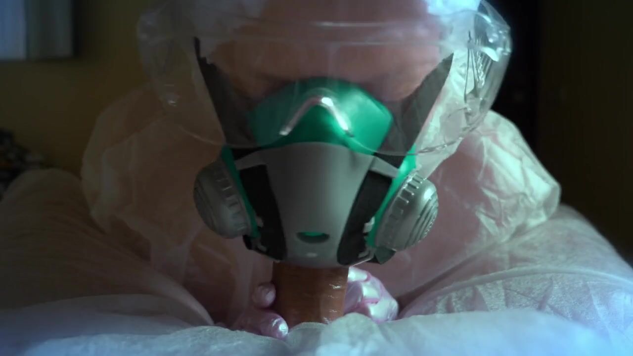 woman in a gas mask and gloves jerks off a cock and sucks. Handjob, blowjob